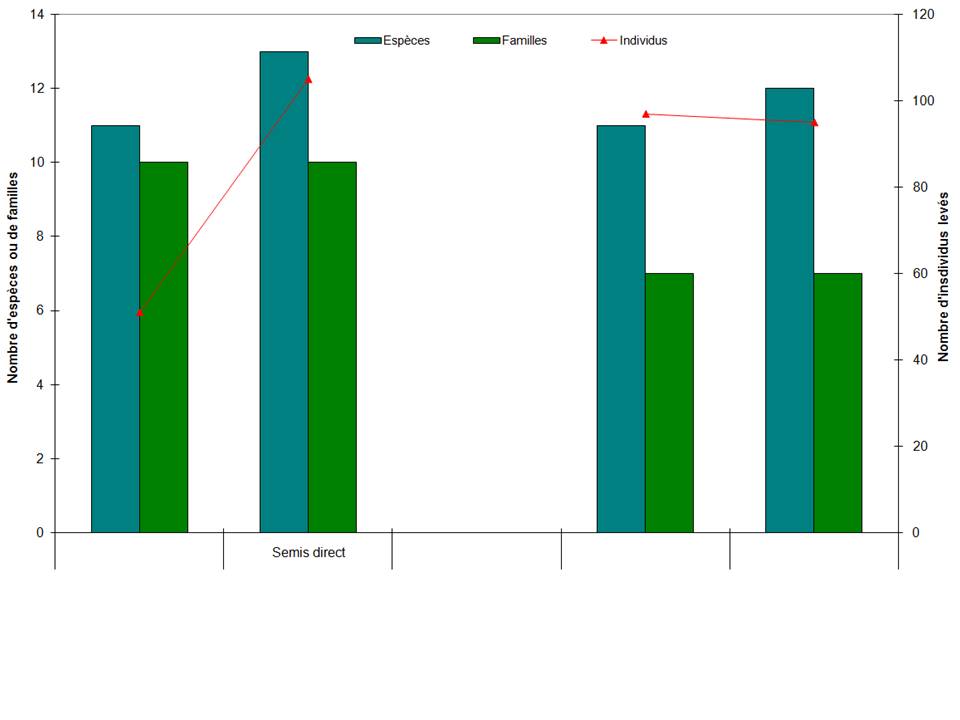 Figure 3. Variation, comparative selon le semis conventionnel et le semis direct, de la flore levée (nombres d’espèces , de familles et d’individus) sur le profil 0-40 cm chez le blé au Domaine expérimental de Douyet en 2010