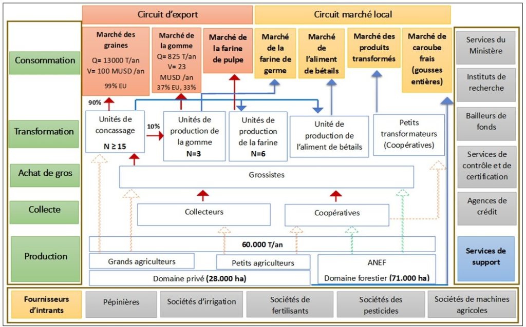 Les principaux acteurs de la chaîne de valeur du caroubier au Maroc sont les producteurs, collecteurs, acheteurs de gros, transformateurs et consommateurs (Figure 1).