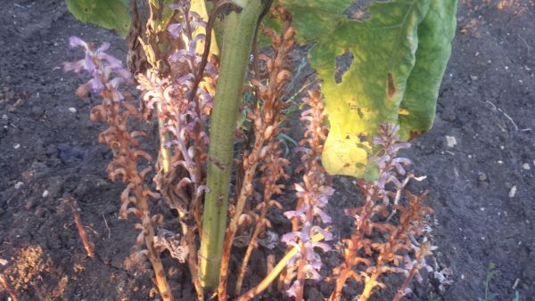 Photo 3 et 4 : Plante de tournesol parasitée par des pieds d’orobanche, avec démonstration de l’attachement au niveau de la partie racinaire